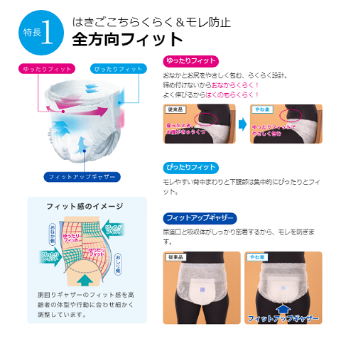 ● お腹まわりはゆったりと楽に、モレやすい背中・下腹部はフィットさせる『全方向フィット』で、はきごこちらくらく。