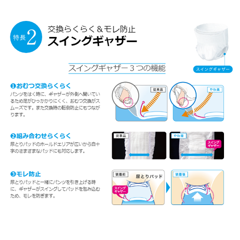 ● 装着時に足がひっかかりにくい『スイングギャザー』で交換』らくらく。