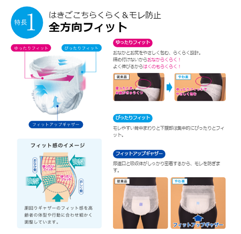● お腹まわりはゆったりと楽に、モレやすい背中・下腹部はフィットさせる『全方向フィット』で、はきごこちらくらく。