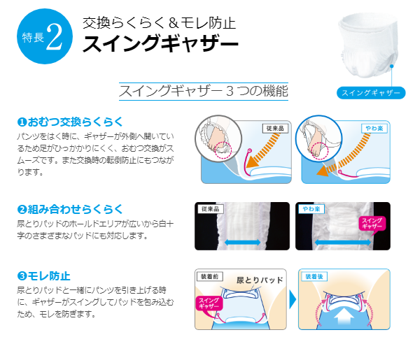 ● 装着時に足がひっかかりにくい『スイングギャザー』で交換』らくらく。