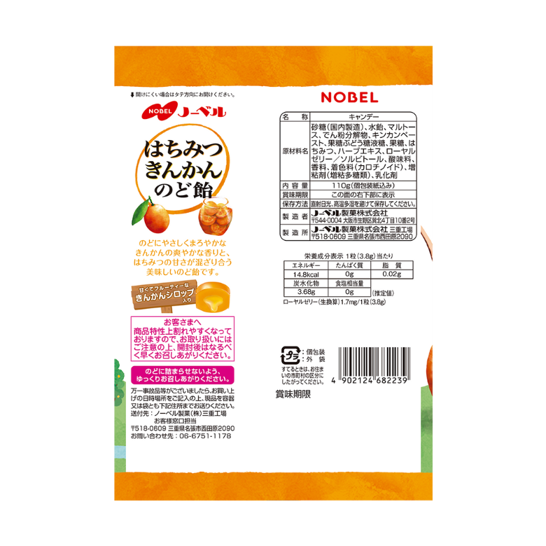 砂糖(国内製造)、水飴、マルトース、でん粉分解物、キンカンペースト、果糖ぶどう糖液糖、果糖、はちみつ、ハーブエキス、ローヤルゼリー/ソルビトール、酸味料、香料、着色料(カロチノイド)、増粘剤(増粘多糖類)、乳化剤