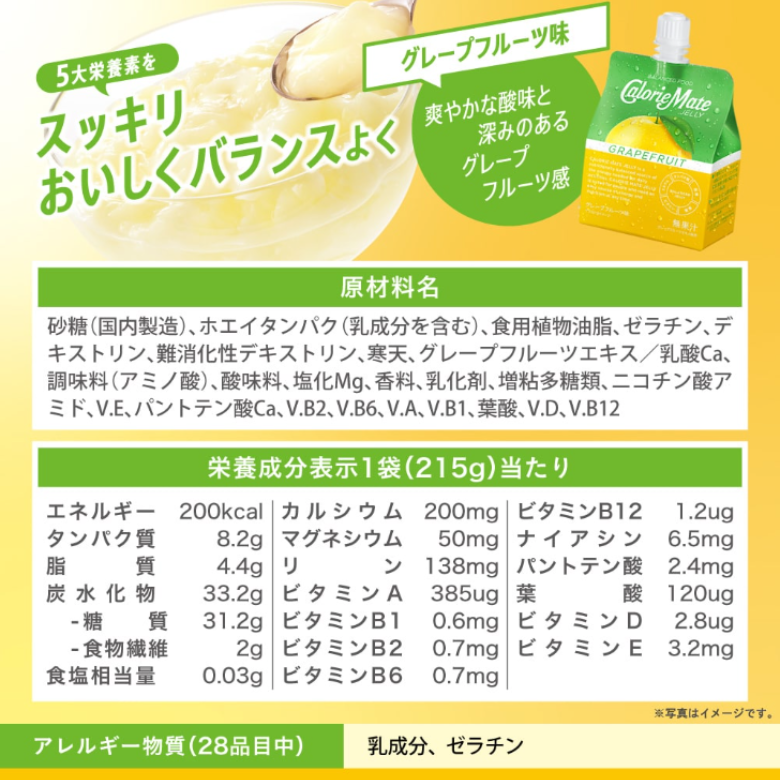 砂糖(国内製造)、ホエイタンパク(乳成分を含む)、食用植物油脂、ゼラチン、デキストリン、難消化性デキストリン、寒天、グレープフルーツエキス/ 乳酸Ca、調味料(アミノ酸)、酸味料、塩化Mg、香料、乳化剤、増粘多糖類、ニコチン酸アミド、V.E、パントテン酸Ca、V.B2、V.B6、V.A、V.B1、葉酸、V.D、V.B12
